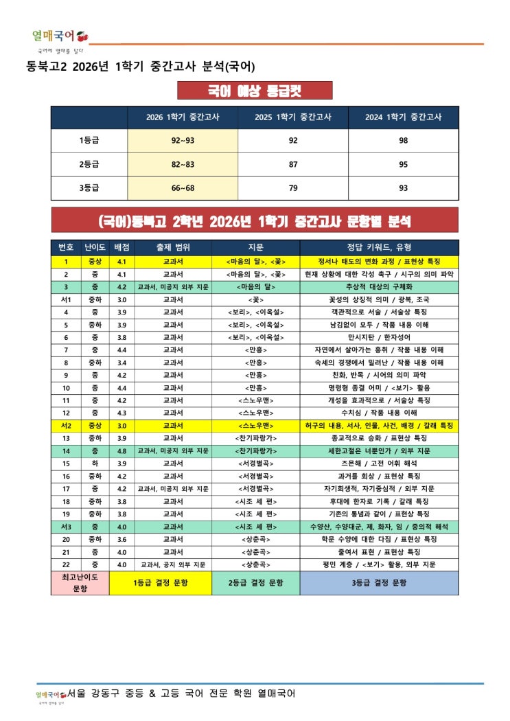 2026년 동북고 2학년 1학기 중간고사 분석 [열매국어 사승훈T 국어]