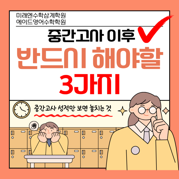 안녕하세요 나나쌤이예요 우리 친구들 중간고사 준비하느라 많이 힘들었는데요 오늘은 시험보다 중요한 중간고사 이후 꼭 해야 할 일들에 대해 포스팅해 볼게요! 중간고사가 끝나고 나면 많은 학부모님들께서 가장 먼저 확인하시는 것은 역시 ‘점수’입니다. 하지만 현장에서 아이들을 지도하다 보면 점수 자체보다 더 중요한 것이 따로 있다는 것을 자주 느끼게 됩니다. 같은 80점이라도 어떤 학생은 곧 90점대로 올라가고, 어떤 학생은 계속 같은 점수에 머무르는 이유가 분명히 존재하기 때문입니다. “우리 아이는 분명히 공부를 했는데 왜 성적이 오르지 않을까요?” 중간고사 이후 상담에서 가장 많이 듣는 질문이기도 합니다. 결론부터 말....... <img src="https://blogthumb.pstatic.net/MjAyNjA0MjhfMTc5/MDAxNzc3MzQzNTM3Mjc2.jSsy4Ge7zf40Ph2jcJ_-lHmbtowVI6PjZvDkbBLo1uQg.hZst7UhSqvC0F2oGsOcuajsu_Ly3CnbM4-q2w3cSdbEg.PNG/%C1%DF%B0%A3%B0%ED%BB%E7%C0%CC%C8%C4.png?type=s3" />