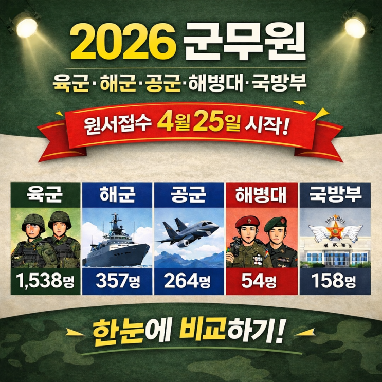 2026 군무원 시험접수 시작! 육군 / 해군 / 공군 / 해병대 / 국방부 채용인원·시험일정 한눈에 비교 2026 군무원 시험을 준비하시는 분들이라면, 이번 주부터 시작되는 원서접수 일정을 꼭 확인하셔야 합니다. 올해도 육군 군무원, 해군 군무원, 공군 군무원, 해병대 군무원, 국방부 군무원 채용이 각각 공고되었고 채용인원과 직렬, 접수 일정이 조금씩 다르기 때문에 내가 어떤 기관에 지원할지 미리 비교해보고 전략적으로 선택하는 것이 중요합니다. 특히 국방부·육군·해군·해병대·공군 군무원 시험은 시험 응시일이 같아 중복 또는 복수 접수가 불가하므로, 반드시 한 기관만 선택해서 지원해야 합니다. 부산 지역에서 군무원 시험을 준....... <img src="https://blogthumb.pstatic.net/MjAyNjA0MjFfMTE4/MDAxNzc2NzU4NTQyMTk5.O1VgNb5UQWY1tSKW4lev5OnJxvNkdDemCZNRdWgIpQcg.lRsOPucbD81GTOe1h1Ez9asAyANXT-llCgZ4h52s-k4g.PNG/765e2b1e-4cfb-4b9f-a18c-2e0d8c60dd7c.png?type=s3" />