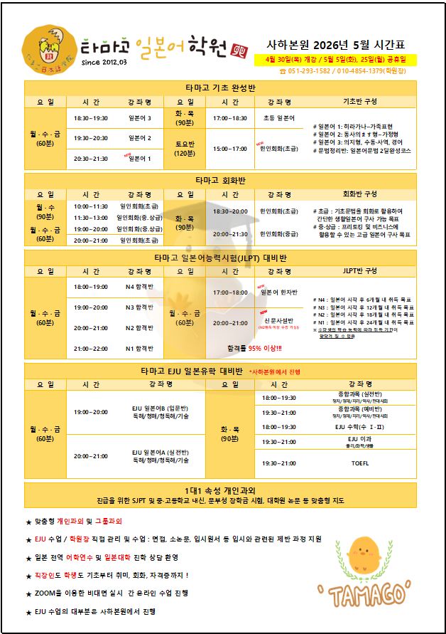 타마고일본어학원에서는 기초부터 회화, JLPT/EJU까지 다양한 과정이 개설되어 있습니다. 정규 수업 외에도 맞춤형 수업과 1:1 개인 과외가 가능하니 수업 시간이나 내용은 자유롭게 조율하실 수 있습니다. ️ 개강일 : 4월30일(목) 사하 본원 부산광역시 사하구 낙동대로 365 3층 ☎️ 051-293-1582(일어빨리) 명지 캠퍼스 부산광역시 강서구 명지오션시티4로 94 명호빌딩 5층 ☎️ 051-294-1582(일어빨리) 5월에도 타마고일본어학원과 함께 頑張りましょうー #타마고일본어학원 #부산일본어학원 #사하일본어 #사하구일본어학원 #명지일본어 #강서구일본어학원 #EJU #일본어기초 #부산일본어공부 #초중고일본어 #성인일본어 #일....... <img src="https://blogthumb.pstatic.net/MjAyNjA0MjBfMTE1/MDAxNzc2NjgwNzY1ODQ4.TuLps4nlmfxC33hhtbj5jqMQNFPwxKU9kXak13zHSCMg.4JCooTnejUo-I5S2FtDrFJccoGBI1cMEAv7Do19tx5Ag.PNG/%C5%B8%B8%B6%B0%ED_%BD%C3%B0%A3%C7%A5_5%BF%F9%28%BB%E7%C7%CF%29.png?type=s3" />