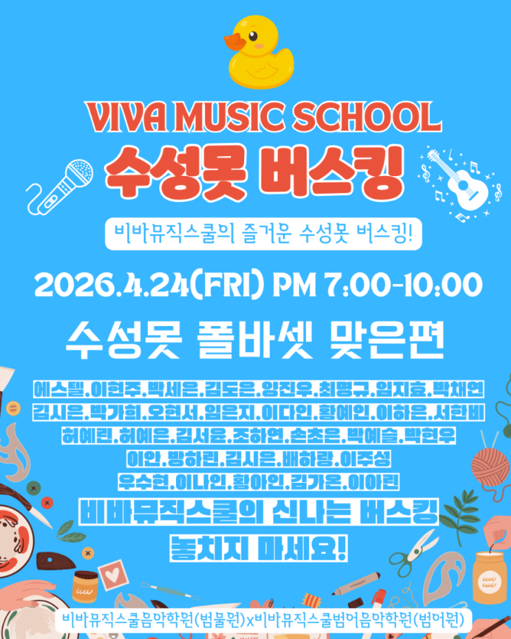 수성못의 낭만적인 밤을 채워줄 비바뮤직스쿨의 버스킹 공연에 초대합니다! 내일 저녁, 수성못 폴바셋 맞은편에서 우리 학생들의 열정 가득한 무대가 펼쳐집니다. 봄밤의 산책과 함께 기분 좋은 음악을 즐기러 오세요! 신나는 무대가 준비되어 있으니 절대 놓치지 마세요. ✨ 공연 안내 일시: 2026년 4월 24일(금) PM 7:00 ~ 10:00 장소: 수성못 폴바셋 맞은편 주관: 비바뮤직스쿨음악학원(범물원) 비바뮤직스쿨범어음악학원(범어원) 참여 아티스트: 에스텔, 이현주, 박세은, 김도은, 양진우 외 다수의 멋진 비바뮤직스쿨 수강생들! 가족, 친구, 연인과 함께 수성못에서 즐거운 추억을 만들어보세요. 내일 만나요! #비바뮤직....... <img src="https://blogthumb.pstatic.net/MjAyNjA0MjNfNDIg/MDAxNzc2OTIzMDg5MjUw.vQS_ECOhPqB_gtIT5E68VSjQOjUQlL2FMbduDU-mEzYg.dAV6724UW7ni0JOg3ZLPoHNU3jWuUUPi1-VZApVno2gg.PNG/900_1776921840224.png?type=s3" />