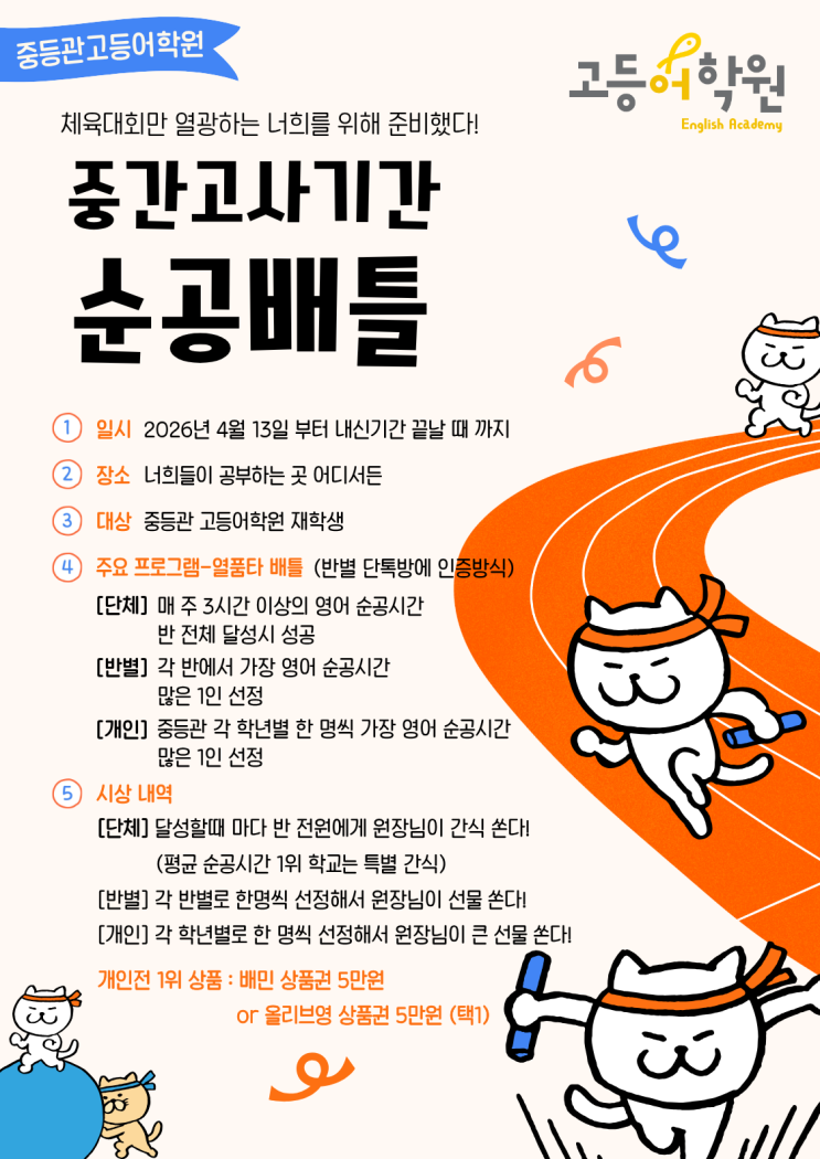 안녕하세요, 영어는 결국 고등어! 고등어학원입니다. :) 중간고사가 코앞으로 다가온 지금, 학원가는 무거운 정적만 흐르기 마련이죠. 하지만 요즘 대구 장기동 중등영어의 중심 고등어학원의 분위기는 사뭇 다릅니다. 아이들이 시험 공부를 '괴로운 숙제'가 아닌 '짜릿한 승부'로 받아들이기 시작했기 때문입니다. 저 오늘 oo이 이기려고 아침에 40분 공부하고 왔어요! 얼마 전, 한 학생이 행정실로 달려와 자랑스럽게 내뱉은 말입니다. 5분이라도 더 자고 싶은 아침 시간에 스스로 타이머를 켜고 공부를 하고 왔다니요! 이 놀라운 변화의 중심에는 바로 고등어 중등부 내신대비 이벤트 [순공배틀]이 있습니다. 이번 이벤트....... <img src="https://blogthumb.pstatic.net/MjAyNjA0MjFfMjQ4/MDAxNzc2NzY4MjQ3NDc2.-PN1yfZtLyY7h4UTmTgSE1oi6AjwN6WLkgEqQrf5AyIg.sOnkYGBDehtzYWud9RlylfITabzW2uBAqjKlKXkcv9kg.PNG/%B3%BB%BD%C5%B4%EB%BA%F1_%BC%F8%B0%F8_%C0%CC%BA%A5%C6%AE.png?type=s3" />