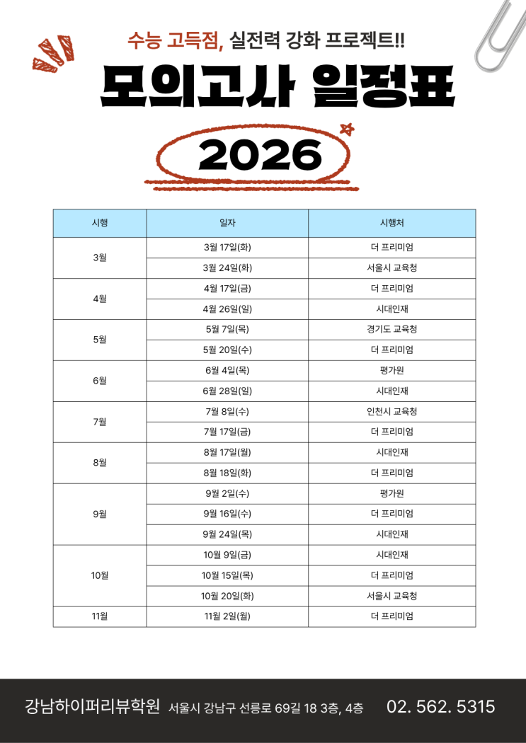 2026년 모의고사 일정 안내 : 5월 경기도 교육청, 대성 더프리미엄, 시대인재 서프. "수능 고득점을 위한 실전력 강화 프로젝트!!" 강남하이퍼리뷰학원