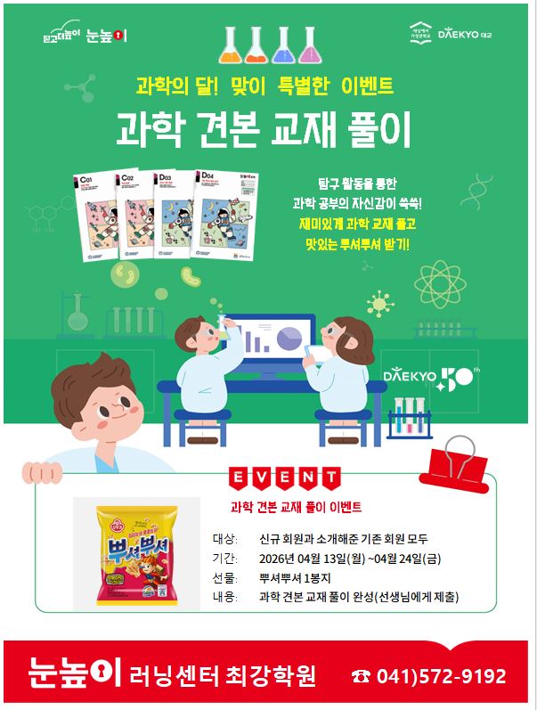 과학으로 성장하는 시간 안녕하세요 ^^ 쌍용동, 불당동 학원 눈높이 러닝센터 최강학원입니다. 4월은 아이들의 호기심이 가장 크게 확장되는 ‘과학의 달’입니다. 눈높이 러닝센터 최강학원에서는 단순한 교과 학습을 넘어, 아이들이 직접 경험하고 탐구하며 배우는 융합형 교육 활동을 진행합니다. ⸻ 1. 바질을 심어요 – 생명과 자연을 배우는 체험형 수업 아이들이 직접 바질을 심고 키워보는 활동을 통해 식물의 성장 과정과 생명의 소중함을 자연스럽게 이해합니다. 단순한 체험이 아닌, ✔ 관찰 → 기록 → 표현까지 이어지는 과학적 사고 훈련 ✔ 책임감과 꾸준함을 기르는 생활 속 학습 습관 형성 그리고 이번 활동은 가정과....... <img src="https://blogthumb.pstatic.net/MjAyNjA0MDhfMjk2/MDAxNzc1NjE1Nzc1MjMy.2u17Wg4LUlcvMKdCR3-uVOOvcmmVMAU-9x2e4yCmpW4g.P8S3dqbZFrydL7ja2XAQep1XvViKOPkjLgf0oizJxlgg.JPEG/%B0%FA%C7%D0%C0%CC%BA%A5%C6%AE_%C3%D6%B0%AD.JPG?type=s3" />