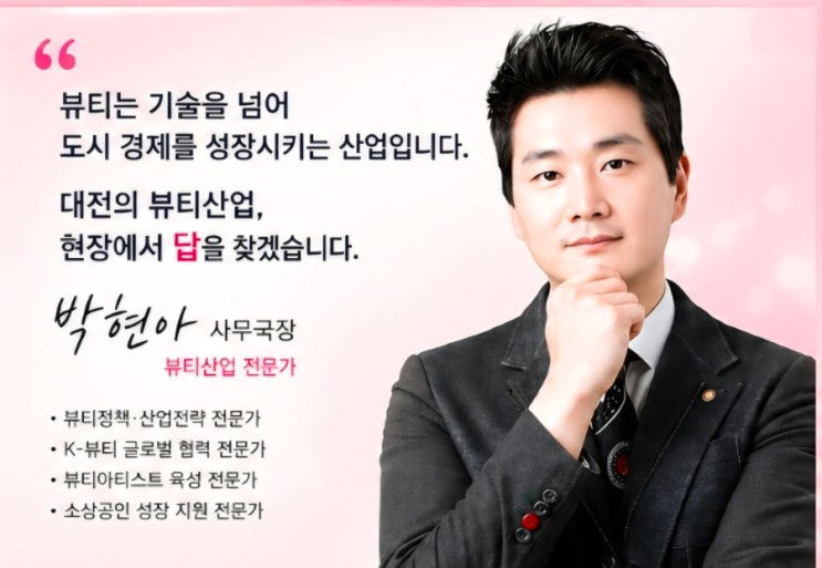 대전뷰티산업 리더 박현아사무국장 지속가능한 성장에서 답을 찾다. Ph.D. 뷰티박사 대전광역시 뷰티산업진흥원 사무국장 뷰티산업은 이제 단순한 서비스 산업을 넘어 도시의 문화와 일상 속에 스며드는 생활 밀착형 산업으로 변화하고 있습니다. 특히 대전시는 기술.문화.인재가 결합되어진 도시로서 지속가능한 뷰티산업 모델을 구축할 수 있는 최적의 환경을 갖추고 있습니다. 이러한 흐름속에서 Ph.D. 뷰티박사 박현아사무국장님은 대전시민과 함께하는 생활 속 뷰티서비스를 지속가능한 산업의 핵심 전략으로 제시 제안하고 있으십니다. 생활밀착형 뷰티서비스 새로운 산업 방향 제시 기존 뷰티산업이 매장 중심의 산업이였다면 이제는 도시....... <img src="https://blogthumb.pstatic.net/MjAyNjA0MjlfMjA4/MDAxNzc3NDIwMTg4NjYw.eKaThxB5XvFTQa2p5Lj1Pma6u6L_9qFc3w5K5UD7wpcg.f266ot9z92Pp8pZKlIGPQOEAy8fqonX1borPmGqpqB0g.JPEG/900_Screenshot_20260428_114212_ChatGPT.jpg?type=s3" />