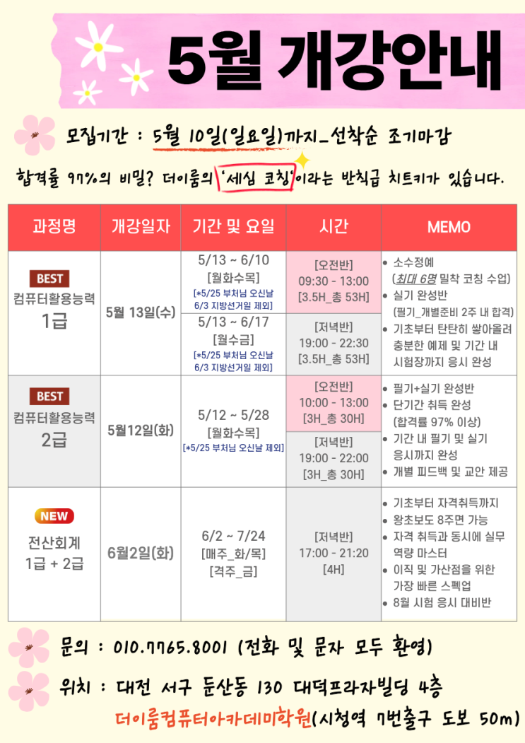 안녕하세요 ~ 더이룸컴퓨터아카데미학원입니다 :) 2026년이 다가온 때가 생생한데 벌써 4월 막바지가 찾아왔네요, 여러분들의 금년도 상반기는 어떻게 흘러가고 계신지 궁금합니다 각각의 다채로운 삶 속 컴퓨터 자격증이라는 목표를 품고 있지는 않으신지요, 아니면 어떤 기업에서나 필요로 하는 경리 및 회계 부서의 필수 자격증인 전산회계 자격증 취득을 요하고 계실지도 모르겠습니다. 여러분들의 목표가 더이룸컴퓨터아카데미학원과 함께 한다면 씨앗의 열매를 맺게끔 적극적인 도움을 드리고자 오늘의 일정을 들고 왔습니다. 대전의 중심, 시청역 1열에 위치한 더이룸컴퓨터아카데미 5월 개강 안내 본격적으로 설명드립니다. ✔️ 컴....... <img src="https://blogthumb.pstatic.net/MjAyNjA0MzBfODkg/MDAxNzc3NTMyMTA4NjYw.dOkoYnxS4kk4cFjLvt69Lbd1F_HCR14mBWzrgOQmsKMg.8BqsZboKRPgglRLeJb-6NH8c5rdlHyZqQA3zp3ULd6Ag.PNG/%C1%A6%B8%F1%C0%BB_%C0%D4%B7%C2%C7%D8%C1%D6%BC%BC%BF%E4..png?type=s3" />