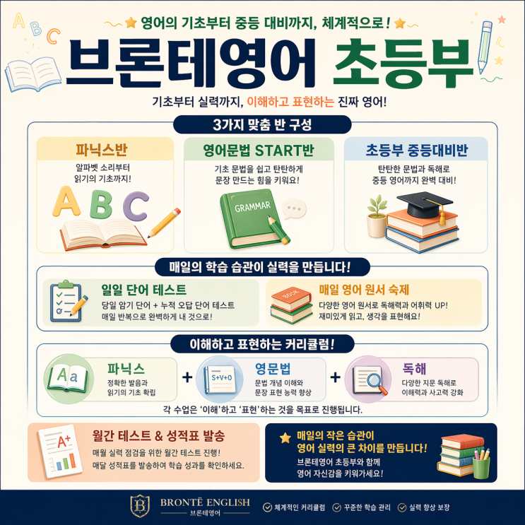 안녕하세요, 브론테영어입니다. 성적으로 증명된 브론테영어와 함께하길 원하시는 초등부 학부모님들께 브론테영어의 신규 커리큘럼을 안내드립니다. 브론테영어는 단순히 문제를 푸는 영어가 아니라, 읽고 이해하고, 스스로 표현할 수 있는 영어를 목표로 합니다. 영어도서관식 원서 리딩과 체계적인 문법·독해 수업을 함께 운영하여 초등부터 자연스럽게 중등 내신과 수능까지 이어지는 실력을 만들어갑니다. 1. 파닉스반 (4명 선착순 마감) 알파벳 소리부터 시작하여 읽기의 기초를 탄탄하게 잡는 과정입니다. 처음 영어를 시작하는 아이들이 부담 없이 영어를 익히고 자연스럽게 읽기로 연결될 수 있도록 지도합니다. 수업시간: 월 / 수 / 금....... <img src="https://blogthumb.pstatic.net/MjAyNjA0MjRfMTA1/MDAxNzc3MDIwMzc3MTI3.m4W7quqZ-Wru4fvL2Dib_zhTlH9SEoqZ--ERYGjiWXsg.CH5_09uQ-1bqrmdhrlM2ABO2kL504qWpCvGh3vsgonEg.PNG/5e0785a7-1a8d-4674-806b-6d09fbbc0ed8.png?type=s3" />
