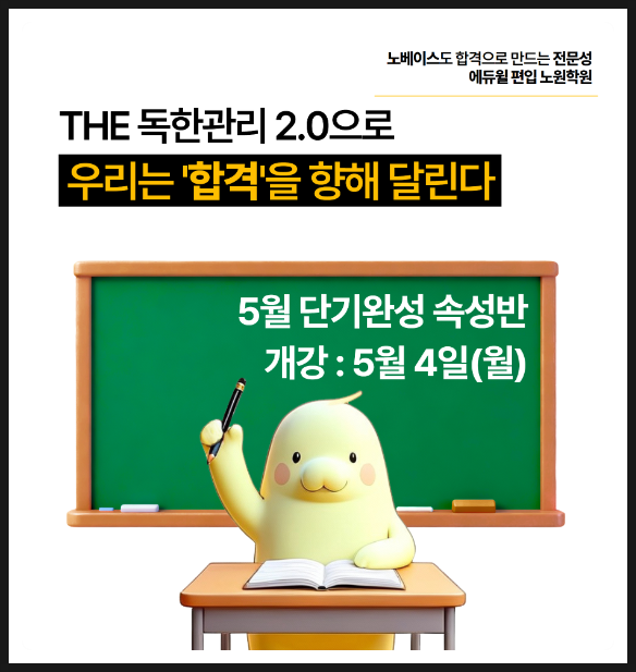 안녕하세요. 에듀윌 편입 노원학원입니다. 편입을 준비해야겠다고 마음먹었지만 어디서부터 시작해야 할지 막막한 분들이 많습니다. 특히 5월은 아직 늦지 않았지만 효율적인 학습 전략이 꼭 필요한 시기입니다. 짧은 기간 안에 기본기를 다지고 실전 감각까지 끌어올리려면 체계적인 커리큘럼이 중요합니다. 에듀윌 편입학원에서는 이런 수험생들을 위해 5월 단기속성반을 개강합니다. 단기완성 속성반 5월 개강 커리큘럼 에듀윌 편입학원 5월 단기속성반은 5월부터 12월까지 단계별로 실력을 완성해가도록 구성되어 있습니다. 먼저 5월~6월에는 ‘입문 다지기’ 단계로 기초가 없어도 문장을 제대로 파악할 수 있도록 기본 어휘와 문법 구조 학....... <img src="https://blogthumb.pstatic.net/MjAyNjA0MjdfMjg4/MDAxNzc3MjgzODEwMDM5.7OB4rFg21TMpRQDmmHl3OPb5cwwJIqs7aRebgi95s9gg.PsO6ROH_TXzN4ZhaGbZ1qj3IUW_6Ye1qBdAkQ9-cBHcg.PNG/image.png?type=s3" />