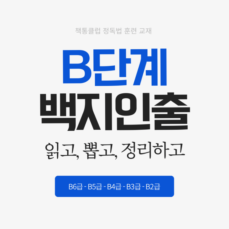 책통클럽 2~2.5년차 아이들이 시작하는 정독법 B단계 훈련 과정을 소개합니다. 정독법 B단계는 B6급부터 시작해서 B5급 - B4급 - B3급 - B2급으로 총 5권 과정으로 구성되어 있습니다. 정독법 B단계는 꼼꼼히 읽고, 핵심 내용을 뽑고, 인출하는 과정인데요, 이 과정의 키포인트는 ‘백지 인출’입니다. 요즘 전과목 공부법으로도 많이 거론되는 ‘백지 인출‘, 책통클럽에서는 이미 수십년 전부터 시작한 공부 방법입니다. B단계를 마친 아이들은 1. 읽은 내용을 기억하려고 생각하는 아이로 2. 중요한 내용이 무엇인지 고민하는 아이로 3. 타인이 읽기 편한 글을 쓰려고 노력하는 아이로 성장합니다. 기계식 문제 풀이에서는 기대할 수 없는 변....... <img src="https://blogthumb.pstatic.net/MjAyNjA0MTlfMjM2/MDAxNzc2NTkzMzk4NTM4.qVbX8oroTfTI8f3Z7Rp9NcR-Eckp_atQlKEySDml9ngg.nFQElL_z_fGNVLCReflTctXqkuISDAraOgfd0uePKyUg.PNG/%C1%A4%B5%B6%B9%FD_%B1%B3%C0%E7_%BC%D2%B0%B3_%A3%AD_1.png?type=s3" />