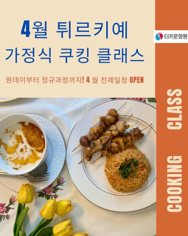 안녕하세요 터키이스탄불문화원입니다! 많은분들이 사랑해주시는 카이막원데이클래스와 15년 넘게 진행하고있는 터키 가정식 쿠킹클래스 :) 이 두 코스를 좀 더 저렴한 가격에 즐겨보실수있는 패키지 코스부터 원데이 클래스까지! 터키 강사분과 함께 세계 3대요리, 터키 요리를 배워보시는건 어떠세요? 벌써 올 한 해가 마무리 되네요. 새해를 맞아, 메뉴 구성 더 빡세게!알차게!맛있게!ㅋㅋㅋ 준비해봤습니다. 4월 클래스도 많은 사랑, 관심 부탁드립니다! 4.11(토) 16:00 키이말르 피데, 보스타나 샐러드, 메르지멕 수프열었다 하면 가장 먼저 조기 마감되는 피데 클래스!터키 음식 하면 빠질 수 없는 피데, 터키식 피자로도 잘 알려....... <img src="https://blogthumb.pstatic.net/MjAyNjA0MTFfMTYg/MDAxNzc1ODg4NjEwODE3.P-P1DmdtjuIs9EbXktCAsHju-SuOZZ8uDxUtusYstHEg.Dvfao-msd0jXDeJ2dUY6Heiq95sHlkL_SndRa83xV60g.JPEG/753a79d1-9582-4792-bbf9-60e857592bc0.jpg?type=s3" />