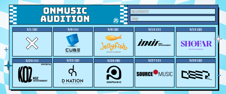 안녕하세요 오디션 전문학원 온뮤직 아카데미 입니다. WE MAKE YOUR DREAM ⭐미리 만나보는 강북점 5월 오디션 황금라인업⭐ ✦✦✦ 국내 최대! 내방 오디션 시스템! 맞춤형 1:1 메이킹 레슨 전문 학원 5월 오디션 리스트 1. 큐브 5월 6일 (수) 6시 30분 <강북> 2. 젤리피쉬 5월 8일 (금) 7시 <강북> 3. 이닛 5월 13일 (수) 7시 <강북> 4. 쇼파르 5월 15일 (금) 7시 <강북> 5. KOZ 5월 20일 (수) 7시 <강북> 6. 디네이션 5월 22일 (금) 7시 <강북> 7. 쏘스뮤직 5월 27일 (수) 6시 30분 <강북> 8. 월말평가 5월 26일 (화) <강북> 9. 딥스튜디오 5월 29일 (금) 7시 <강북&gt....... <img src="https://blogthumb.pstatic.net/MjAyNjA0MTZfNzAg/MDAxNzc2MzE4Mjc5MDg5.f77ZKpu9OeO-nU0tJqYHbz3J7xSDMN8ikqEh2aPVUV0g.eYmiD-XKEjGwKXrNB90iYuHZULpeWtmCfjPQNTt3frMg.PNG/KakaoTalk_20260416_134530290.png?type=s3" />