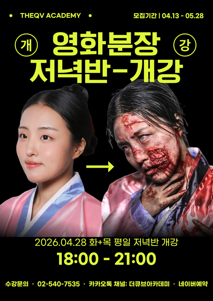 안녕하세요~ 특수분장 전문 교육 학원 더큐브아카데미입니다! 오늘은 반가운 소식을 전해드려요~ 기존에 평일 오후반과 주말반으로 운영되던 영화분장반이 많은 분들의 요청에 힘 입어 평일 저녁반까지 개강 확정되었답니다~! 그동안 시간 때문에 수강이 어려우셨던 분들도 이제는 더 편하게 수강하실 수 있어요! 또한 오늘은, 현장팀 준비하는 플랜까지 이야기해드릴 예정이니 특수분장 수업과 취업에 관심있으신 분들은 주목해주세요! 영화분장 저녁반, 이런 분들께 추천드려요! 그동안 영화분장 수업에 관심은 있었지만 시간이 맞지 않아 고민하셨던 분들이 정말 많았는데요, 또한 현재 개강되어있는 오후반과 주말반은 많은 수강생분들의....... <img src="https://blogthumb.pstatic.net/MjAyNjA0MTdfMjI4/MDAxNzc2Mzk5NzgxMTY0._jEr9F5HDKURLV1QuL1c1PpdUb99tLoOFGx1LGmnP1Ug.eAYU-3CTmx0URpFE0YTFQXp7Jr74nQu-rVhYlhCRgLwg.PNG/KakaoTalk_20260417_110904127.png?type=s3" />