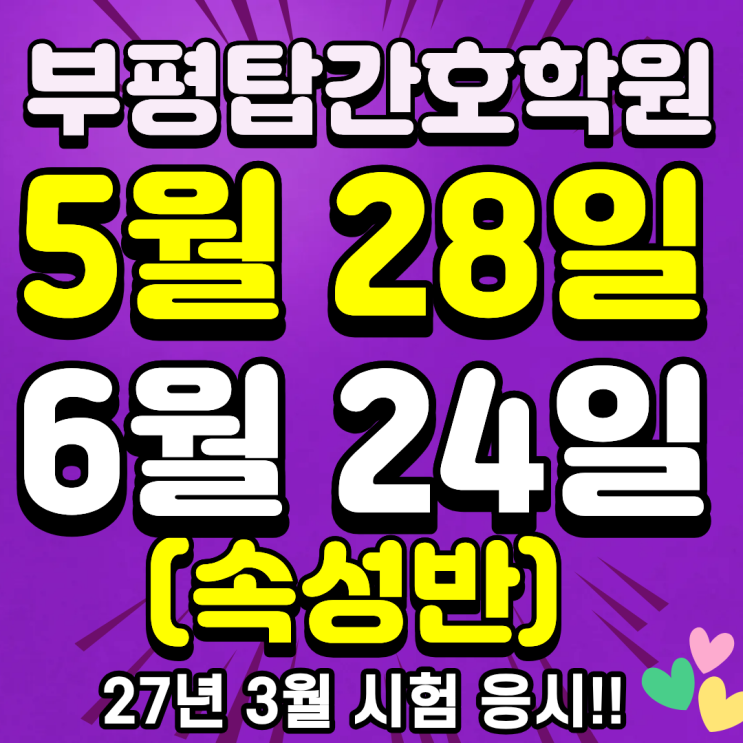 단기속성반 모집중!! 26년 5월 28일 개강! 26년 6월 24일 개강! 안녕하세요~ 인천간호학원부평탑간호학원입니다^^ 새싹이 파릇 파릇 돋는 기분좋은 봄이 되었어요^^ 부평탑간호학원 학생들은 지금 봄을 만끽하며 각반의 수업에 열심히 참여하며 열공 중이랍니다^^ 간호에 관심있는 분들을 위하여 부평탑의 일상을 바로 포스팅하겠습니다^^ 인천간호학원부평탑간호학원 26년 봄학기 속성반 선찬순 모집중!! 국비/일반 26년 5월 28일 개강! 26년 6월 24일 개강! 짧은 기간 단기간에 과정을 수료하여 취업하는 속성반에서 예비 간호조무사 분들을 기다리고 있습니다^^ 국시합격과 병원취업은 노동부 5년인증 우수훈련기관, 훈련과정 A등급학원 부평....... <img src="https://blogthumb.pstatic.net/MjAyNjA0MjFfNzcg/MDAxNzc2NzcyNDMxNjI1.1ghb_w53OnZSn8ks7SGNTjcCTfLTX58xNBddqZyKdbIg.y2d59fpm_-v1XgjgHGoEWXyoXIoSQ6e7gHESxy9WIdwg.PNG/1.png?type=s3" />