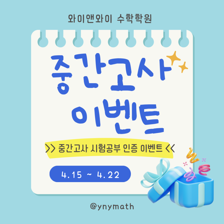 중간고사 이벤트 열공하는 모든 와이애니들을 응원해 이번 중간고사에 와이앤와이가 작은 이벤트를 준비했어요 ✅ 참여기간 : 4월15일(수) ~ 4월22일(수) ✅ 참여방법 중간고사 공부를 열심히 한다. 공부 증거를 사진으로 찍는다. 이벤트 기간동안 인스타그램에 와이앤와이가 포함된 해시태그와 함께 게시물을 올린다. 원장님께 카톡으로 인스타 아이디를 보내면 끝! 비공개 개정은 이벤트 참여가 되지 않으니 반드시!! 기간 종료일까지 공개 계정을 유지해 주세요 ✅ 상품증정 : 4월 24일 일괄 증정 이번 시험기간 모두모두 힘내요~! 전주 인후동 와이앤와이 수학학원 오시는 길 등록번호 제754....... <img src="https://blogthumb.pstatic.net/MjAyNjA0MTVfNzMg/MDAxNzc2MjMyMDIyNjkw.sDQ0qQp8kSj66kyxu8uzkOWFZsZhD7vw7nZ0LNjJEY4g.J0hzoQl90OVC1K3JPJYVxZV5KOUEtBwy_2jigPh_7IEg.PNG/KakaoTalk_20260415_000139697.png?type=s3" />