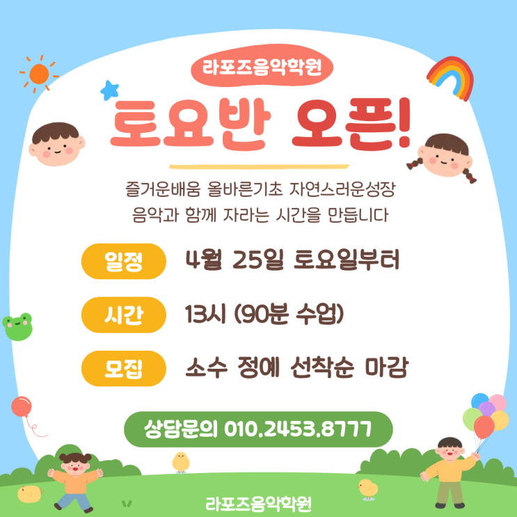 안녕하세요 라포즈 음악학원입니다 라포즈에서 토요반을 새롭게 개강하게 되었어요 주중 시간이 바빠 피아노 수업 시간을 맞추기 어려웠던 친구들, 학원이나 방과후 이후 추가로 더 학습하고 싶었던 친구들, 조금 더 밀도 있게 피아노를 배우고 싶었던 친구들을 위해 토요반을 준비하게 되었어요 라포즈에서는 즐거운 배움 속에서 올바른 기초를 탄탄하게 다지는 것은 물론 아이의 수준과 속도에 맞춰 심화과정과 콩쿨 준비까지 이어갈 수 있도록 지도하고 있어요✨ 토요반은 (1시 / 1시 30분 / 2시) 3가지 반으로 운영되며, 60분 수업으로 진행돼요. 소수 정원으로 운영되어 선착순 모집으로 조기 마감될 수 있으니 관심 있으신 분....... <img src="https://blogthumb.pstatic.net/MjAyNjA0MjJfMjM5/MDAxNzc2ODQ5OTM4MTE1.ZHLFF0FRtnLx6gIR3yYx1AenOGJokYWF74hQAFnBp0Eg.9-qJSQMgKFzWYDq-cQ7A0XCdiO_ccoeYYhnedtGXadAg.PNG/%C1%A6%B8%F1%C0%BB_%C0%D4%B7%C2%C7%D8%C1%D6%BC%BC%BF%E4..png?type=s3" />