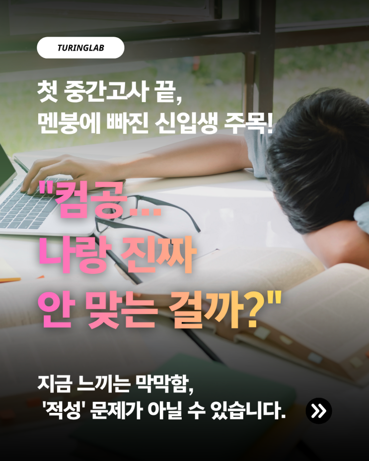 부산컴퓨터학원 "컴공 신입생 첫 중간고사 후 멘붕인가요? 적성이 아니라 기초의 문제입니다." 안녕하세요, 튜링랩 프로그래밍 학원입니다. 4월 말, 대학교의 첫 중간고사가 끝났습니다. 설레는 마음으로 입학했던 컴퓨터공학부, 소프트웨어, 인공지능학과 등 신입생들에게는 아마 이번 시험이 인생에서 가장 큰 '현타'가 온 시점일지도 모릅니다. "교수님 말씀은 외계어 같아요." "책을 봐도 코드가 왜 이렇게 돌아가는지 모르겠어요." "나만 빼고 다들 잘하는 것 같은데, 전과해야 할까요?" 지금 이런 고민을 하고 있다면, 여러분만 그런 것이 아니니 안심하세요. 왜 전공 수업이 어렵게 느....... <img src="https://blogthumb.pstatic.net/MjAyNjA0MjNfMTc0/MDAxNzc2OTM4MTU3MjM3.WBdFn_Ud0mjvxakglqNxMimde1xSZjFC8w7EF_NzM2wg.7TSCXcmTvIwnrnANz2WesvBKSih1JISasgqyIHLJRsMg.PNG/1.png?type=s3" />