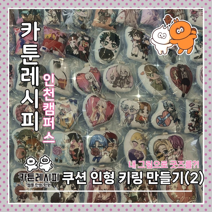 안녕하세요! 인천 웹툰/만화 학원 카툰레시피 초등반, 중고등 취미반 입니다. 어느덧 새학기로 분주했던 3월도 끝이나고, 4월이 되었어요! 다들 새로운 반 분위기와 새롭게 사귄 친구들에 대한 이야기를 많이 들려주는데요~ 아이들이 학교에서도 잘 적응하고 있는 듯 해 기쁜 요즘입니다 지난 3월, 2월부터 시작 되었던 굿즈 만들기 이벤트, <쿠션 인형 키링 만들기> 수업에 대해 포스팅 했었죠? 오늘은 3월 말에 드디어 도착한~! 초등반, 중고등 취미반 학생들의 도안으로 멋지게 만들어진 쿠션 키링을 보여드릴까 합니다. 모두들 언제 오는지 재차 물어볼 정도로 애타게 기다려주었어요ㅎㅎ 워낙 학생들이 도안을 잘 마무리 해주....... <img src="https://blogthumb.pstatic.net/MjAyNjA0MDhfMTAx/MDAxNzc1NjI1NDIwMTkw.t7TUF1wn29g3ZdalZyFPse-nQNMJnNPXo7cx4wJpG80g.NCrtd58VxQ43dGn0zqg4xFiCQC4GkhHrPGpjh6s-kq8g.JPEG/0401_%BA%ED%B7%CE%B1%D7_%BD%E6%B3%D7%C0%CF.jpg?type=s3" />