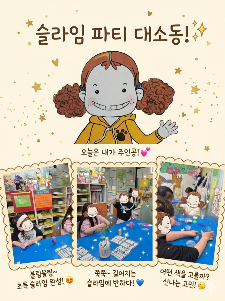 안녕하세요! 우리아이들의 무한한 상상력을 응원하는 미술쌤이에요~ 오늘은 아이들이 가장 기다려온 시간! 손끝으로 느끼는 촉감 예술, '슬라임 & 마카 아트' 수업 현장을 소개해드릴게요. 엄마들도 아이들도 모두 반할 수밖에 없는 우리 교실의 생생한 풍경, 함께 보실까요? 1. 오감을 자극하는 다채로운 슬라임 월드! 슬라임 수업의 시작은 역시 화려한 재료들이죠! 파스텔 톤의 예쁜 색감부터 사랑스러운 하트 모양, 그리고 과즙미가 팡팡 터질 것 같은 젤리 & 탄산 컨셉의 용기까지! 아이들은 재료를 고르는 것만으로도 이미 설렘 가득이랍니다. 시각과 촉감을 동시에 자극하는 이 예쁜 교구들은 아이들의 미적 감각을 깨....... <img src="https://blogthumb.pstatic.net/MjAyNjA0MTdfMTI4/MDAxNzc2Mzk4Mzc0NTMx.xx8Y3KRDM2ccYQFaKTc0SjVc5GYCDXcznlT-N1TkKdUg.zXuxIRI9xZn_AbkhWNeNBsBJiPfNmb-DVmXBj5kGp04g.PNG/Gemini_Generated_Image_mwyvjdmwyvjdmwyv.png?type=s3" />
