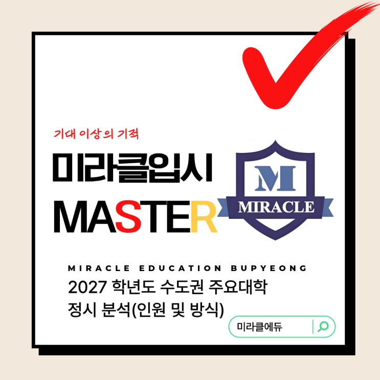 안녕하세요? 인천에서 가장 핫한 입시 정보를 제공하는 미라클에듀입니다. 2026년 첫 중간고사 준비가 한창인 4월입니다. 날씨도 따뜻하고 꽃도 피며 각종 축제들이 가능한 시간에 대학 진학을 위해 열심히 공부하는 수험생 여러분!! 여러분의 노력에 응원을 보내며 인천에서 가장 핫한 입시정보를 제공하는 미라클에듀는 오늘도 입시 자료를 포스팅합니다. 오늘은 2027학년도 수도권 주요 대학의 정시 전형을 분석하는 첫 번째 시간을 갖도록 하겠습니다. 분석 글을 올리기 전에 먼저 말씀드리고 하는 내용이 있습니다. 인천이나 부천 등에서 학습하는 수험생 상당수가 수능 응시와 정시 지원에 대해 막연한 공포심을 갖고 있습니다. 정시는 서....... <img src="https://blogthumb.pstatic.net/MjAyNjA0MTdfMTY4/MDAxNzc2NDA2OTMwMjcw.qHH0jAf2TJ9umcdZny16gu-iYPcknhioyL4EmT-7cpsg.NSatwSqyoZLuBdVfTIhhHugJgQ9KBC_u83P0R7Xzj14g.PNG/%C1%A6%B8%F1%C0%BB_%C0%D4%B7%C2%C7%D8%C1%D6%BC%BC%BF%E4._-_2026-04-17T152150.486.png?type=s3" />
