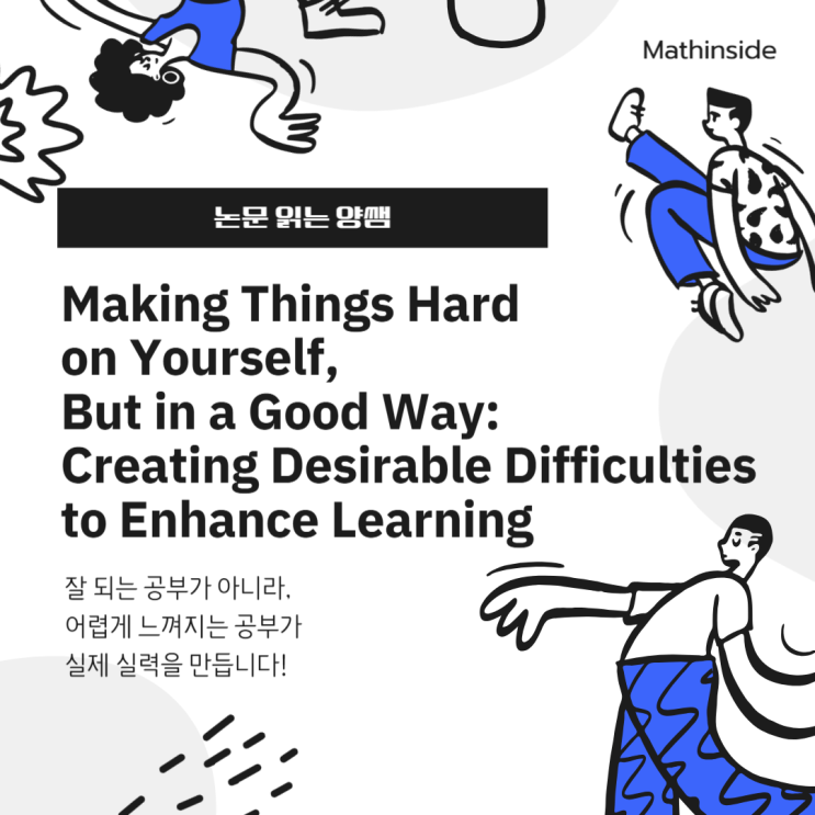 안녕하세요 아이들의 학습 방향을 함께 고민하는 매쓰인사이드 수학학원입니다 . . . . . 오늘은 학생들이 가장 많이 착각하는 “공부의 기준”에 대해 이야기해보려고 합니다. Bjork, R. A., & Bjork, E. L. (2011)의 연구 Making Things Hard on Yourself, but in a Good Way 이 논문은 왜 어떤 공부는 열심히 해도 남지 않고, 어떤 공부는 오래 남는지를 아주 명확하게 설명해줍니다. 잘 되는 공부의 함정 많은 학생들이 공부가 잘 됐다고 느끼는 기준은 비슷합니다. 문제를 많이 맞췄을 때 반복해서 풀었을 때 설명이 익숙하게 느껴질 때 하지만 논문에서는 이런 기준 자체가 잘못된 판단일 수 있다고 설명합니다. 이유는 간단합니....... <img src="https://blogthumb.pstatic.net/MjAyNjAzMjNfMjA0/MDAxNzc0MjUyMDA5OTYw.5-gWQGDvwAOvzK_MKgflB9hcnJ5arjEchoPtlcty9Lgg.l1BLw12_xmiowsHfXKNQKIfMgwizKBfGCBB3M0P-c5Ig.PNG/%C1%A6%B8%F1%C0%BB_%C0%D4%B7%C2%C7%D8%C1%D6%BC%BC%BF%E4_-001_%2811%29.png?type=s3" />