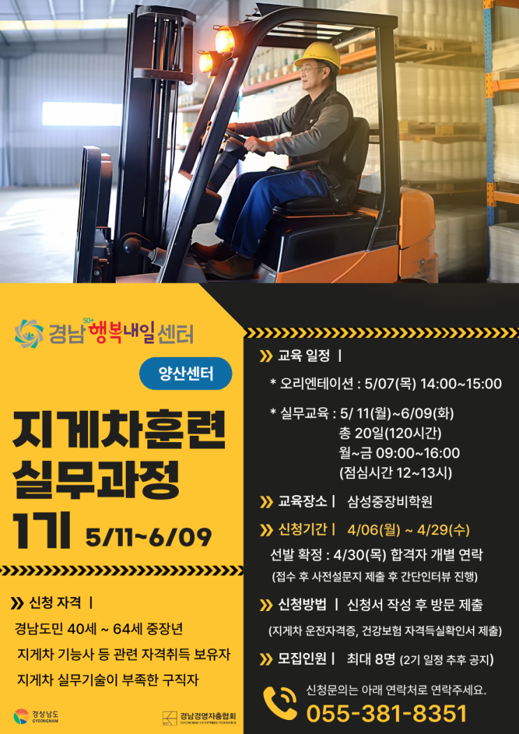 중장년 취업 준비, 지게차 실무교육으로 시작하세요! 안녕하세요 취업을 고민 중인 중장년 분들을 위한 좋은 소식 전해드립니다! 경남 지역에 거주하시는 40세~64세 분들을 대상으로, 지게차 실무 중심 취업 교육 과정이 진행됩니다. 전액무료 지원 수업이니 모두 주목!!! 지원 대상 ✔ 경남도민(부산시민 불가능) ✔ 만 40세 ~ 64세 중장년층 필수 조건 ✔ 3톤 미만 지게차 교육 이수자 또는 ✔ 지게차 기능사 자격증 보유자 기본 자격이 있으신 분들이라면 누구나 지원 가능합니다! 교육 내용 이번 교육은 단순 이론이 아닌 실제 취업에 바로 활용 가능한 실무 중심 과정입니다. ✔ 좌식 지게차 실습 ✔ 입승식....... <img src="https://blogthumb.pstatic.net/MjAyNjA0MDhfMjk1/MDAxNzc1NjI1MTUxOTc4.e7XFrHhC3SQGwi9uezmO680oavIahg8MrB4mJb7S4fkg.q-2gsUut31FWxQTWHYRgPMe6Ox5hHTzWfB_HsI4njDMg.PNG/KakaoTalk_20260408_095045350.png?type=s3" />