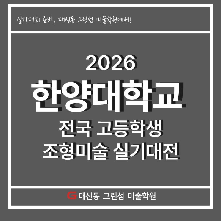안녕하세요~ 부산 대신동 그린섬 미술 학원입니다! 오늘은 미대 입시를 준비하는 학생이라면 꼭 주목해야 할 2026년 한양대학교 전국 고등학생 조형미술 실기대전에 대해 자세히 안내드리려고 합니다. 실기대전은 전국 고등학생 대상으로 진행되는 대회로, 실기 실력 점검과 함께 입시 감각을 키울 수 있는 중요한 기회입니다. ● 대회 일정 2026년 6월 4일(목) ~ 6월 7일(일) ● 접수 기간 2026년 4월 17일 ~ 5월 15일 ● 시험 시간 총 5시간 실기 진행 ● 장소 한양대학교 ERICA 캠퍼스 올해 대학 실기 대회를 통하여 실제 입시와 유사한 환경에서 실력을 검증할 수 있는 실전 경험이라는 점에서 매우 중요한 의미를 가집니다. 대회 주제는 추....... <img src="https://blogthumb.pstatic.net/MjAyNjA0MTVfMjE1/MDAxNzc2MjUwMDE3MTY0.2gWQiRhZMtj_fLFDaw6rp-rmwTT8odmGCVBtbfm3DKgg.SvyAiZW_RELcUIxQFDqpotkH2GzkhEIP2YFOOo4kZOkg.JPEG/1.jpg?type=s3" />