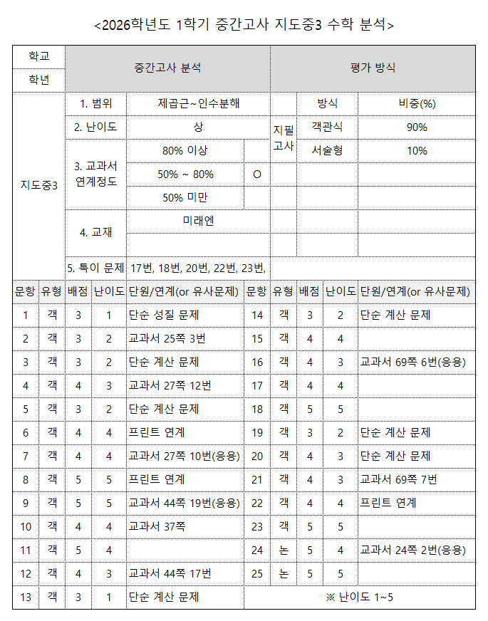 2026년 1학기 중간고사 지도중3 분석.