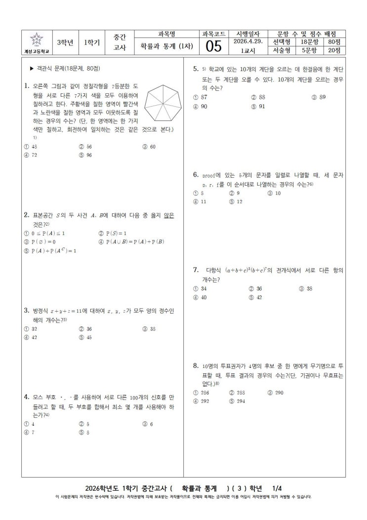 계성고 고3 1학기 중간고사 대비 확률과 통계 파이널 1,2,3,4차