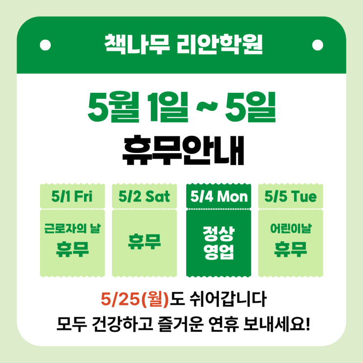 안녕하세요 책나무 리안학원입니다. 따뜻한 봄기운이 가득한 5월, 가정의 달이 바로 앞으로 찾아왔습니다. 가족과 함께하는 소중한 시간을 보내실 수 있도록, 아래 일정에 따라 책나무와 리안영어의 휴무를 진행하게 되어 공지드립니다. ️ 5월 휴무 일정 안내 휴무일 ▶ 5월 1일(금) 근로자의 날 휴무 ▶ 5월 2일(토) 휴무 ▶ 5월 5일(화) 어린이날 휴무 ▶ 5월 25일(일) 부처님 오신 날 대체공휴일 휴무 ※ 해당 날짜에는 상담 및 수업 운영이 진행되지 않으니 이용에 참고 부탁드립니다. 5월은 가족과 함께하는 시간이 더욱 특별하게 느껴지는 달입니다. 바쁜 일상 속에서도 잠시 멈추어 사랑하는 사람들과 따뜻한 추억을 쌓는....... <img src="https://blogthumb.pstatic.net/MjAyNjA0MjBfMTAy/MDAxNzc2NjY3ODQ5MzEw.JCAiAEpBGltXeTq2OtdL8C2CMB0BAAQT0vHaUYUOgaEg.NRwI6UyvOvbp7hQCXeCwoZ1kj97YGAfsr0sjs2XMyVwg.PNG/%C1%A6%B8%F1%C0%BB_%C0%D4%B7%C2%C7%D8%C1%D6%BC%BC%BF%E4..png?type=s3" />