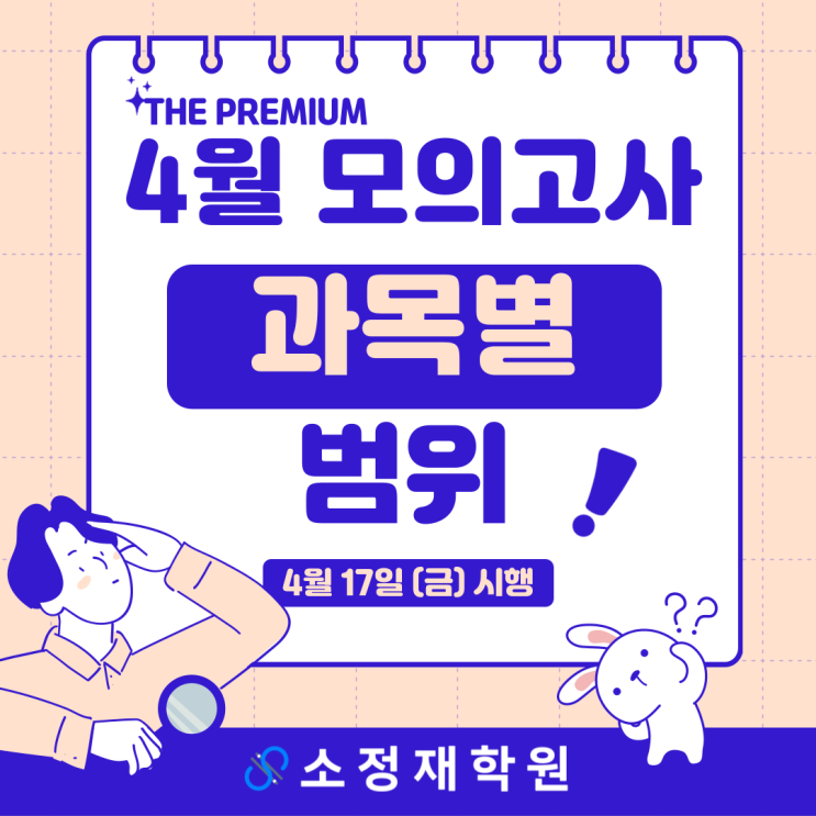 안녕하세요 노원 독학재수학원 소정재학원입니다. 4월 대성 더 프리미엄 모의고사가 4월 17일 금요일에 시행됩니다. 과목별 출제 범위를 알려드립니다. 국어, 영어, 한국사는 전 범위에서 출제됩니다. 수학은 공통은 전범위에서, 확률과 통계는 경우의 수 까지, 미적분은 여러가지 함수의 미분까지, 기하는 벡터의 연산까지 출제됩니다. 사회탐구는 전 범위에서 출제됩니다. 과학탐구 중 물리학Ⅰ, 화학Ⅰ, 생명과학Ⅰ, 지구과학Ⅰ은 전 범위에서 출제됩니다. 물리학 Ⅱ는 전자기장과 전기력선까지, 화학Ⅱ는 반응 엔탈피와 헤스 법칙까지, 생명과학Ⅱ는 세포 호흡과 광합성까지, 지구과학Ⅱ는 한반도의 지질까지 출제됩니다. 소정재학원에서 4월....... <img src="https://blogthumb.pstatic.net/MjAyNjA0MTFfMjM2/MDAxNzc1ODczNzAzMDMy.0eX7o4qK939OAieRgxnNgV7CmvFq9HTWl2SfDzFMMTMg.-NPKVvAN1WT_NusnF-B_Uc-be6QgcGGzZE1tCTNp1uYg.PNG/26%B3%E24%BF%F9%B4%F5%C7%C1_%281%29.png?type=s3" />