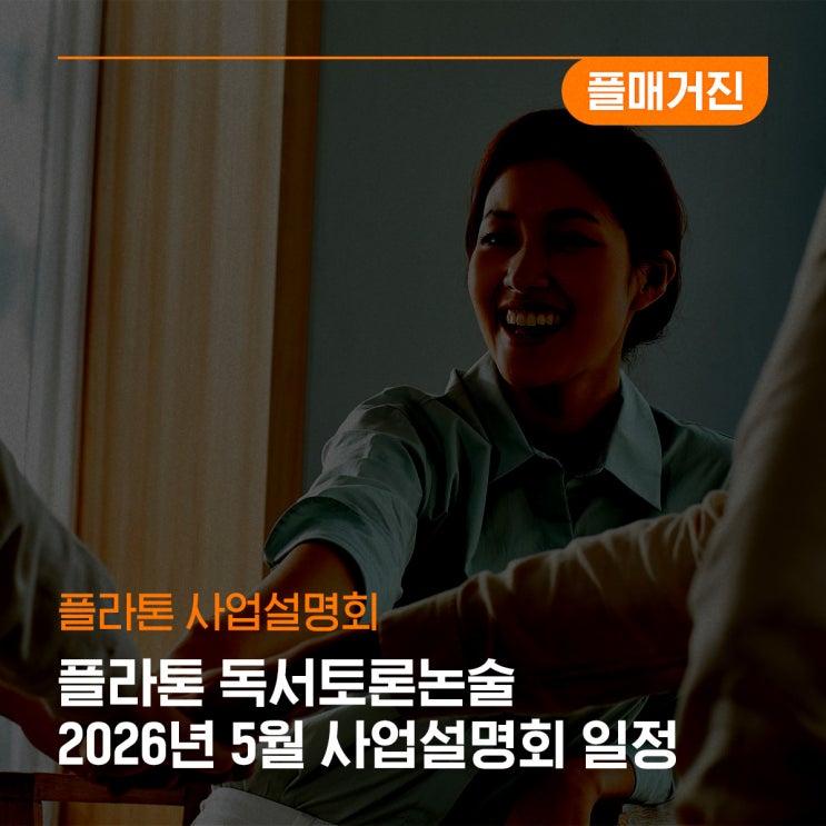 아이와 보내는 시간이 유난히 더 소중하게 느껴지는 5월✨ 학부모들은 이 시기에 흔들리지 않는 학습 구조를 찾기 시작합니다. 아이 교육의 방향을 다시 점검하고, 학부모가 아닌 ‘교육 파트너’로서 한 단계 더 나아갈 수 있는 자리. 그리고 동시에, 교육 사업을 고민하는 분들께는 현실적인 운영 방식과 가능성을 확인할 수 있는 기회입니다. 막연했던 고민을 구체적인 방향으로 바꾸는 시간, 이번 5월 플라톤 사업설명회에서 직접 확인해 보세요 예비 원장님을 위한 2026년 5월 신규 오픈 혜택! 플라톤 독서토론논술 <2026년 5월 사업설명회> 일정 및 연락처 안내! 해당 지역 플라톤 독서토론논술 지국의 위치 및 연락처를 꼭! 확....... <img src="https://blogthumb.pstatic.net/MjAyNjA0MjlfODcg/MDAxNzc3NDE5NDgwMjc3.Pn9qo_XhzY641KHVS2GbFVcctezlMnX57VElKNyHU90g.71FJOhYhn7O2WIeLO0EVw_Z7tnjP77zOJaIN6m0I_mEg.JPEG/%C7%C3%B6%F3%C5%E6_%BD%E6%B3%D7%C0%CF_2025.jpg?type=s3" />