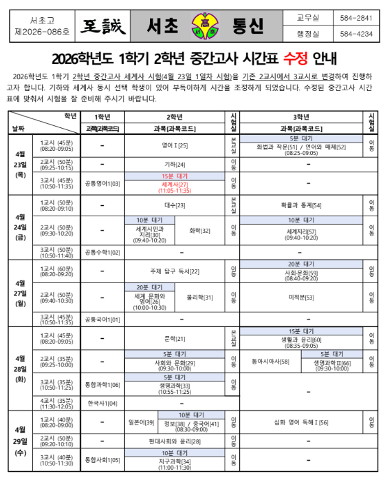 서초고 중간고사 2학년 시간표 수정 안내 <img src="https://blogthumb.pstatic.net/MjAyNjA0MjJfMjAw/MDAxNzc2ODI0OTQwODIx.nZecEXeGEFZMfC2rKe5zxqX86vPHVvUk0XXigv2wyCsg.AYuxdIT9H04Xf9-MH8qQBbSQno8HFPFkBxr2ibZYYrcg.PNG/image.png?type=s3" />