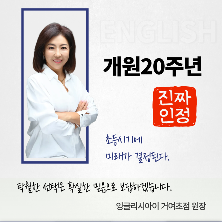 목동에서 수업을 하다, 송파구로 이사 와서 학원을 개원한지 어느덧 20년이라는 시간이 흘렀습니다. 제가 영어 교육 현장에서 학생들을 지도한 시간은 30년 가까이 됩니다. 그동안 초등학생부터 중학생, 고등학생까지 다양한 연령대의 학생들을 만나왔고, 그 과정에서 영어 학습의 본질과 가장 중요한 시기를 누구보다 깊이 체감할 수 있었습니다. 오늘은 단순히 개원 20주년을 기념하는 글이 아니라, 제가 오랜 시간 교육 현장에서 느낀 점을 바탕으로 영어 학습의 핵심을 이야기하고자 합니다. 1. 영어 학습의 출발점은 초등 시기 많은 학부모님들이 중학교나 고등학교에 진학하면서 영어의 중요성을 절실히 느끼곤 합니다. 그러나 실제로 영어....... <img src="https://blogthumb.pstatic.net/MjAyNjA0MTVfMjM4/MDAxNzc2MjM0NDA2ODE5.iDtD_-6pFchVIHs825Hi2WMuaUOwdgVvHake-rPgY8gg.aeiOGFKzje0Dr-wb7GsNcfNtR1GcOOwfdN_4pYBFow8g.PNG/%BF%F8%C0%E5%BA%ED%B7%AF%B1%D7.png?type=s3" />