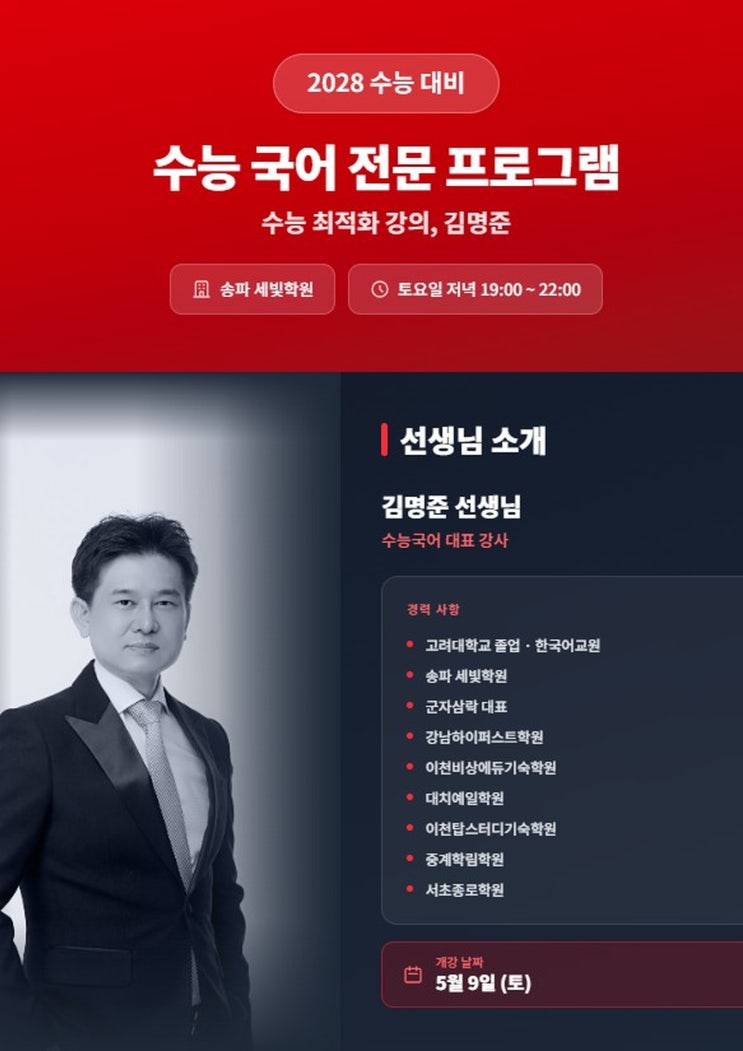 [특급공지] 고2 국어, '김명준 비법노트'로 정시 1등급의 길을 엽니다! 안녕하세요, 김명준 국어입니다. 고2, 이제는 내신을 넘어 수능이라는 큰 산을 넘어야 할 때입니다. 막연한 문제 풀이만으로는 절대 수능 국어의 벽을 넘을 수 없습니다. 오직 김명준 국어에서만 만날 수 있는 **'압도적 차별화'**를 공개합니다. 왜 '김명준 국어'인가? "단순히 답을 찾는 기술이 아니라, 정답이 도출되는 논리를 가르칩니다." 철저한 기출 분석: 최근 5개년 수능 및 평가원 기출을 완벽 분석하여 출제 원리를 전수합니다. 독해의 정석: 비문학(독서)의 구조 독해와 문학의 개념어 적용을 통해 어떤 지문이 나....... <img src="https://blogthumb.pstatic.net/MjAyNjA0MjFfNTYg/MDAxNzc2NzYyMDE0MzUx.w7Li-LXsMwek2bdjhIcgicc6Y5IJRuuWMf2iDCDL9ukg.0qsYhkZ15NAODnLRvhw-_D7trn58vMNMCdU3HR82L6Qg.JPEG/KakaoTalk_20260421_085016915.jpg?type=s3" />