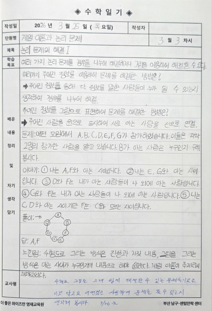 3월 우수 수학일기 및 학생을 소개합니다. 우수 학생들 모두 축하합니다. 수학일기 작성은 수업시간에 어려웠던 문제를 다시 한번 풀어보고 요약정리 하면서 자신의 생각을 글로 표현하고 사고의 체계를 갖추어 갈 수 있는 중요한 과정 입니다. 더 좋은 와이즈만 센텀안락센터에서 학생들의 사고의 폭을 넓혀주는 사고력 수업이 진행되고 있으니 많은 참여 연락 부탁드리겠습니다. <img src="https://blogthumb.pstatic.net/MjAyNjA0MjNfMTMw/MDAxNzc2OTQwNDk4NTA1.ZmCFq5xxkcPh2aojYKgIj0QiqB2nI2X0epDofFKMVF4g.Vuuv8AN2LXnftAPgqiCUir2iI1iVhauxHj_m39MgUL8g.JPEG/GA5_%C3%D6%C0%B1%BC%ADB.jpg?type=s3" />