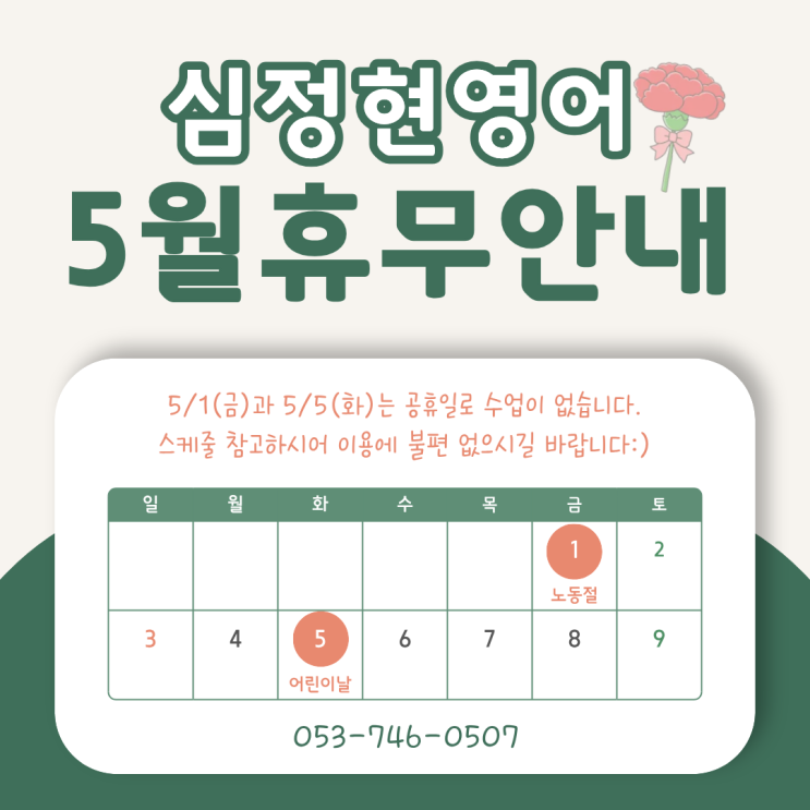 5/1 (금) 노동절과 5/5 (화) 어린이날은 공휴일인 관계로 수업이 없습니다. ((5/4 월요일은 정상수업입니다)) 사전에 스케줄 확인하시어 이용에 불편 없으시길 바랍니다. 감사합니다:) 카카오톡채널 - 심정현영어 <img src="https://blogthumb.pstatic.net/MjAyNjA0MTRfMTc0/MDAxNzc2MTQyOTM2NjUz.JvVox8gyU1Yckc0DyA6iiRw-DJehUSahFCmMHq73TyUg.Jrdrhj4pwx6kXZE6EfbEYcpXE3SRMAomfNQDYzih6Qkg.PNG/5%BF%F9%C8%DE%B9%AB%BE%C8%B3%BB.png?type=s3" />