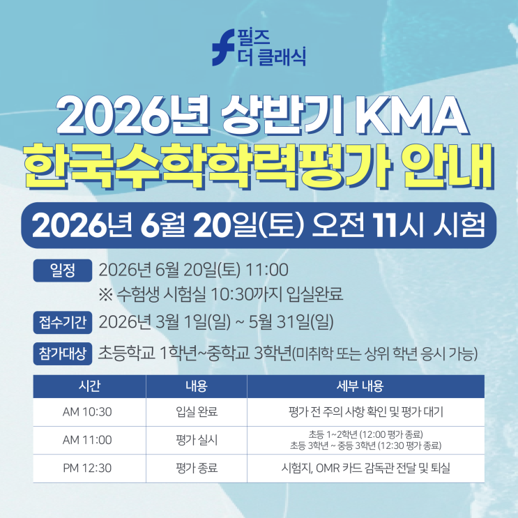 범어동사고력수학 2026년 상반기 KMA 한국수학학력평가 안내 소식을 전해드립니다. 안녕하세요, 학부모님 필즈더클래식 필즈수성에서 인사드립니다. 오늘 필즈수성에서는 2026년 상반기, 다가오는 6월에 진행되는 KMA 한국수학학력평가 일정 안내 소식을 전해드리려 합니다. KMA 한국수학학력평가란? 국내 최초의 수학학력평가는 교과 과정을 중심으로 학생 개개인의 수학 실력을 객관적으로 평가하여 현재의 수학 학습수준을 정확히 파악하고 분석하여 앞으로의 학습 방향을 제시하는 연 2회의 전국 단위의 100% 오프라인 평가입니다. 응시 대상은 초등학교 1학년부터 중학교 3학년으로 다가오는 6월 20일(토) 진행되며, 접수기간은 지난 3월 1일....... <img src="https://blogthumb.pstatic.net/MjAyNjA0MTVfNDQg/MDAxNzc2MjIxODc0MTc2.XD7ZT3HLrzu7Z8lJYJ8pcdZQpCpMMhDs6o6o7eJ8Omog.APIhix3fuepepPlipIQ1HVeUF8dzSiJRJq6p5hHgS-Ug.PNG/%B4%EB%C1%F6_6_%BB%E7%BA%BB_4.png?type=s3" />