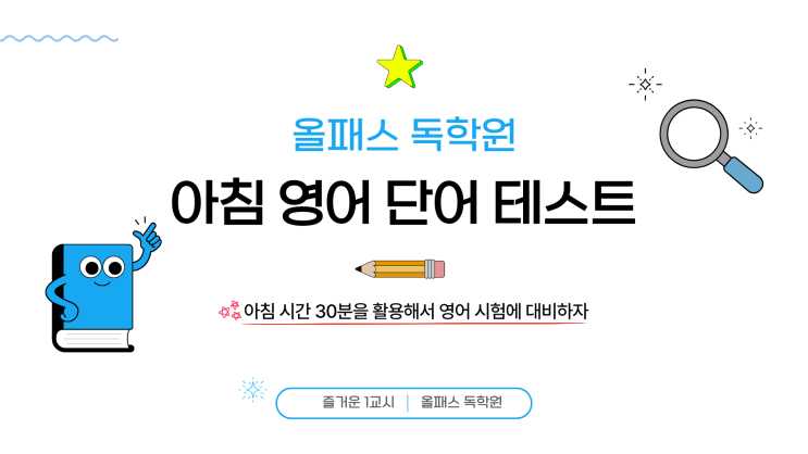 안녕하세요 여러분 대구 동성로 중심에 위치한 대구관리형독서실 올패스 공무원 독학원입니다. 체계적인 관리 시스템과 다양한 프로그램을 통해서 학생을 관리하고 있는 관리형 독서실 올패스 독학원은 매일 아침 1교시마다 "영어 단어 테스트"를 진행하고 있습니다. 영어 단어 테스트는 국가직/지방직 시험을 준비하는 수험생 분들을 위한 시험으로 아침 1교시를 좀 더 효율적으로 활용할 수 있도록 신청자를 받아서 진행하는 테스트입니다. 올패스 독학원 영어 단어 테스트란? 올패스 독학원에서 진행하는 영어 단어 테스트는 1교시인 08:30 - 09:00에 진행됩니다. 시험 종료 이후에 오픈 채팅방에 답지가 업로드가 되고, 답안 채....... <img src="https://blogthumb.pstatic.net/MjAyNjA0MTZfMjAg/MDAxNzc2MzMyMjMyMzMz.vKtacy6hBLerr4Ha_tb3IteN5krWyvIvfRYyJrQcD3Ag.iav9eUq-cm8KExr9n5ocSwxNbo9pN-8Ofc7cLeyZhVsg.PNG/1.png?type=s3" />