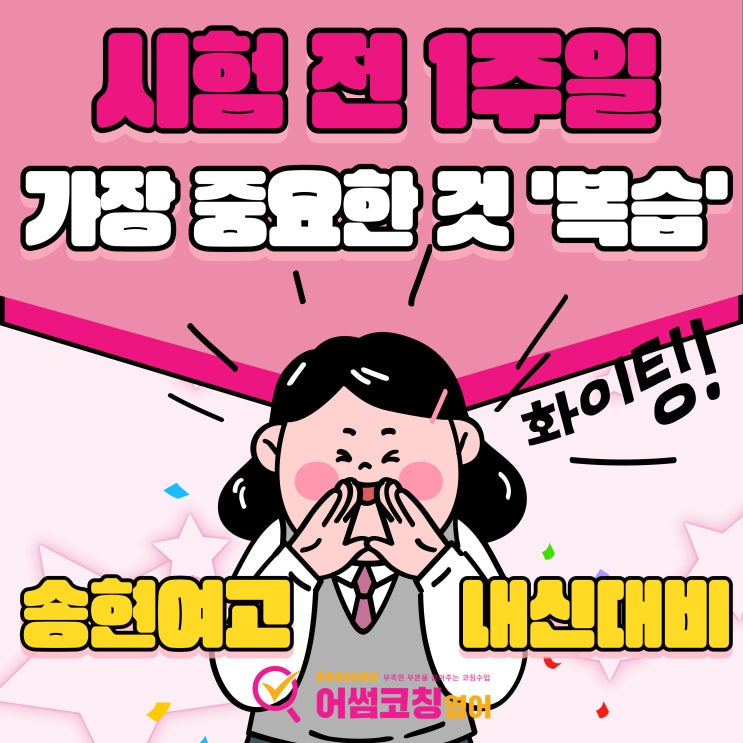 송현여고 영어 내신, 지금이 점수를 완성하는 마지막 타이밍입니다. 안녕하세요, 어썸코칭영어학원입니다 :) 현재 송현여고 영어 시험 대비는 전 지문 진도가 모두 완료된 상태입니다. 그리고 지금, 시험까지 약 일주일 정도 남은 시점입니다. 이 시기는 새로운 내용을 배우는 시간이 아니라 점수를 완성하는 ‘복습의 시간’ 입니다. 왜 시험 직전에는 복습이 가장 중요할까요? 많은 학생들이 “이미 한 번 다 봤는데…”라고 생각하지만, 실제 시험에서는 ✔ 기억이 흐릿해진 지문 ✔ 정확히 정리되지 않은 주제 ✔ 헷갈리는 내용 이 부분에서 점수가 갈립니다. 아는 것과 ‘바로 떠올릴 수 있는 것’은 완전히 다릅니다. 그래서 시험 직....... <img src="https://blogthumb.pstatic.net/MjAyNjA0MThfMTY4/MDAxNzc2NDkxNDkxMDQ5.jlC15ogVC_P3zuKNBTeyxN_dO3Y6ClEj7eWq9rvAPzMg.4OtYZRbTfCuy1SKMrcsILZS3C11SsJKSI1wUz7j77Ugg.JPEG/%BE%EE%BD%E6-%BA%ED%B7%CE%B1%D7-%B4%EB%C7%A5%C0%CC%B9%CC%C1%F6-001.jpg?type=s3" />