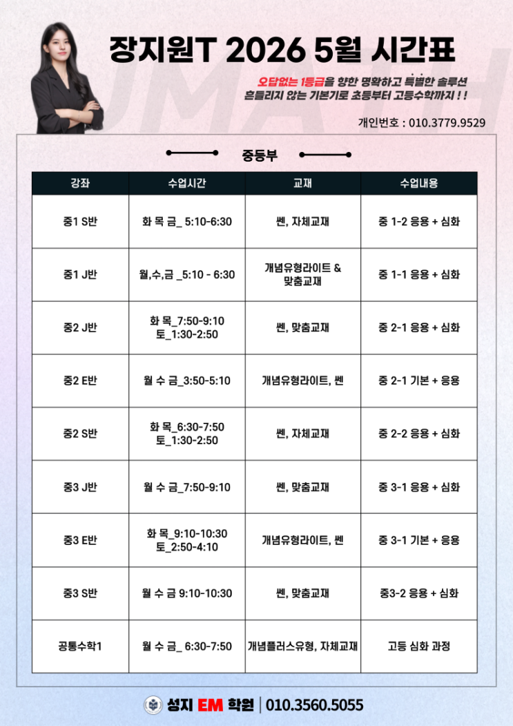 [청명대입학원] 메이딘영어 26년 5월 시간표 - 5월 7일(목) 개강 (중3, 고1, 고2, 고3)
