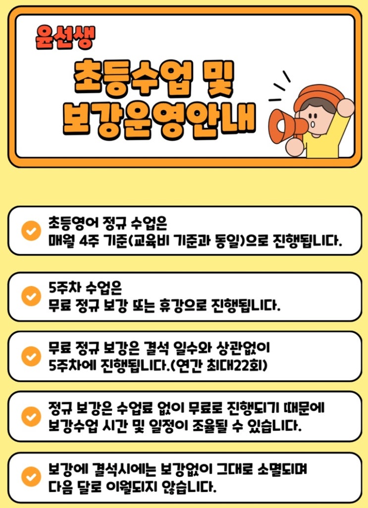 안녕하세요. 만년동 영어학원입니다. 귀한 자녀를 믿고 맡겨주신 학부모님께 감사드립니다. 우리 아이와의 영어수업에 관련된 몇 가지 안내사항을 전달드릴게요. 만년동 윤선생의 초등 수업 시간은 아래와 같습니다. ♥초등 기본 과정(1) 오후 1:45-3:15 (90') ♥초등 기본 과정(2) 오후 3:15-4:45 (90') ♥초등 심화 과정 오후 4:30-6:30 (120') ♥예비 중학과정 저녁 6:30-8:30 (120') 첫 수업에서 우리 아이들에게 챙겨주실 초등 영어 수업 준비물입니다. ⭐️영어 교과서 자습서 및 평가 문제집 ⭐️영어 노트(3권) ⭐️연필+지우개(각 3개씩) ⭐️빨간 색연필(3자루) 모든 준비물에는 이름표를 붙여서 보내주세요 다....... <img src="https://blogthumb.pstatic.net/MjAyNjA0MjBfMjgg/MDAxNzc2Njg1Njg4NzIy.keD0JJVmGzrseTAdl0Mu9AgEoG9gn8bsVIFMRBre3wIg.hJbsyrXJ-yli8PIpclCTKvOMn183xUG2xp6YiNKy2IUg.JPEG/IMG%A3%DF9654.jpg?type=s3" />