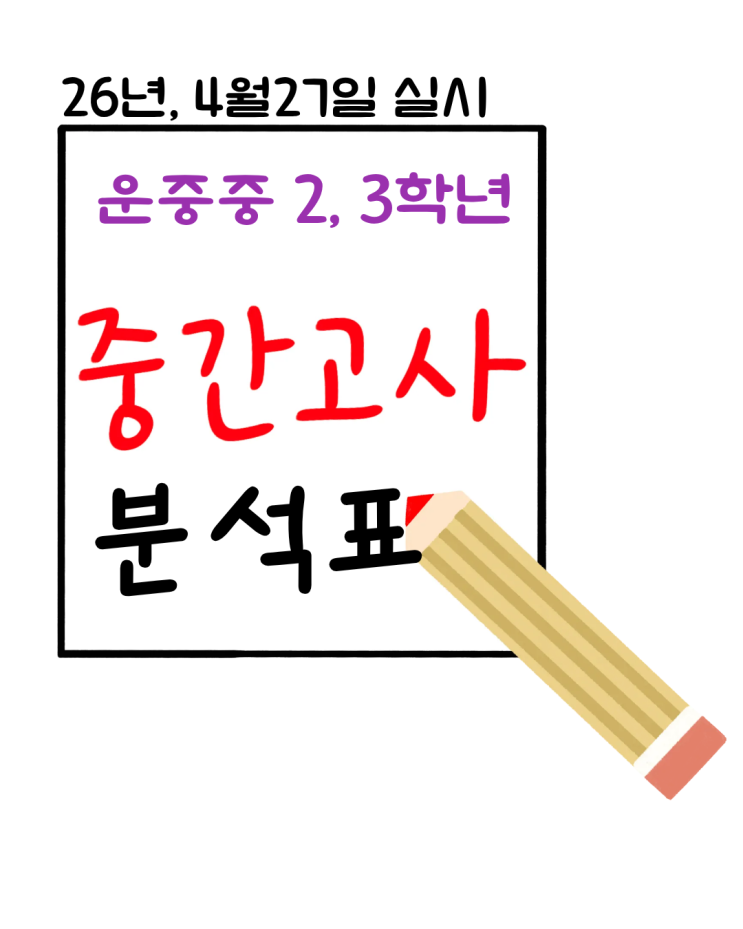 안녕하세요 운중동에 위치한 조민희영어학원입니다. 27일(월), 어제 운중중학교 중간고사 영어 시험이 있었습니다. 실제 시험에서 어떤 유형이 출제되었는지, 앞으로 어떻게 대비해야 하는지까지 함께 확인해 보시길 바랍니다. 분석표 바로 올라갑니다 운중중3 영어 중간고사 분석 및 총평 내신대비 준비 직보때 요약 설명한 문법들이 시험이 객관식으로 그대로 출제 되었습니다. 특히 주요문법 althoug /depite 구별~~ 조금만 공부하고 신경쓰면 누구나 다 맞을수 있는 문제들 !!! 중3 영어 시험 분석 총평 운중중 3학년 영어 시험은 전체적으로 평이한 난이도였으나, 문법과 어휘 중심의 정석형 시험으로 출제되었습니다. 특히 계속....... <img src="https://blogthumb.pstatic.net/MjAyNjA0MjhfMzAg/MDAxNzc3MzQwNzI3NDUx.5VDZzUBWqYUdZvkkBAVk505QfNmVFy3iPT8H9zaahY4g.TOLSEUAI0WfjgqPZQGh8wUsew8hieynAwoPi0sEVDJ8g.PNG/%C1%A6%B8%F1%C0%BB_%C0%D4%B7%C2%C7%D8%C1%D6%BC%BC%BF%E4._%2834%29.png?type=s3" />