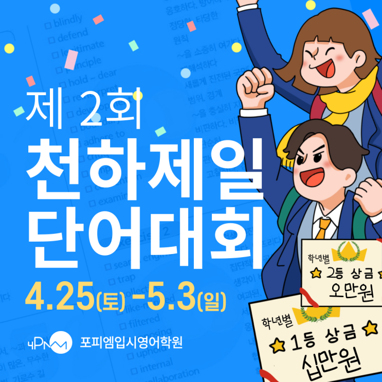 안녕하세요, 포피엠영어학원입니다. 4월 25일(토) - 5월 3일(일) <제2회 천하제일 단어대회>를 진행합니다. 포피엠의 단어대회는 매 학기 중간고사 직후 진행되는 포피엠만의 전통이자 학습 시스템입니다. 학생들의 단어 암기 동기를 높이고, 실력도 점검합니다. 아래 사진은 지난 제1회 단어대회 초대 챔피언의 수상 현장입니다. 이번 제2회 단어대회, 그 결과로 여러분의 실력을 증명해보세요. 감사합니다. ↘ 오른쪽 N예약 / 전화를 누르시면 상담예약으로 이동합니다. ↘ <img src="https://blogthumb.pstatic.net/MjAyNjA0MTdfMTEz/MDAxNzc2NDIwODQxODE5.Fb3s0xmNCE8g-_jQVf0VFD_n8YWDcQlFxI3jwHTm7JUg.souys8n7JjXpkoVqgkiBUn7WyIi0xlHSN7I_f5B-A3kg.PNG/%C0%CC%BA%A5%C6%AE-%C6%F7%BD%BA%C5%CD-%BD%E6%B3%D7%C0%CF-001.png?type=s3" />