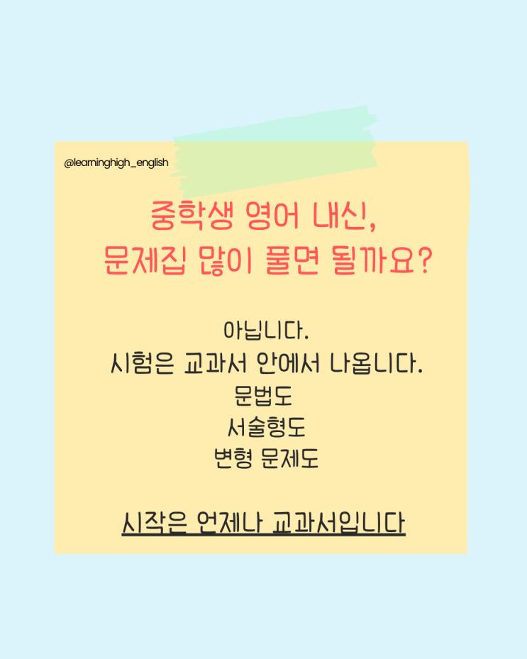 중학생 영어 내신은 “많이 푸는 것”보다 교과서를 얼마나 정확하게 내 것으로 만들었는지가 성적을 좌우합니다. 문제집은 여러 권 풀었는데 점수가 오르지 않는 경우가 많습니다. 이유는 단 하나입니다. 시험은 ‘교과서 안에서’ 나오기 때문입니다. 그래서 오늘은 러닝하이에서 실제로 적용하는 교과서 중심 내신 대비 전략을 정리해 드릴게요. 고창중, 운양중 영어 내신 대비 전략 - 교과서 중심 “교과서는 시험 범위 전부”라는 인식부터 바꿔야 합니다 많은 아이들이 교과서를 “읽는 자료” 정도로 생각합니다. 하지만 내신에서 교과서는 단순한 읽기 자료가 아닙니다. 문법 문제의 근거 서술형 문장의 원본 변형 문제의 출발점 즉, 교....... <img src="https://blogthumb.pstatic.net/MjAyNjA0MjBfMTEg/MDAxNzc2NjU2MDY2NjY2.QuUYZ8dAOqbdNk_QD4kSmHb02rz0_osBCWebladC8TYg.6tYTvnmMxNhGp43jfQqTzwQH4E16k9nJXKsW8mqMY5Ig.PNG/1.png?type=s3" />