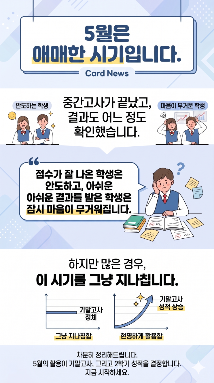 안녕하세요. 김포수학학원 하이런수학학원입니다 :) 5월은 애매한 시기입니다. 중간고사가 끝났고, 결과도 어느 정도 확인했습니다. 점수가 잘 나온 학생은 안도하고, 아쉬운 결과를 받은 학생은 잠시 마음이 무거워집니다. 하지만 많은 경우, 이 시기를 그냥 지나칩니다. 시험이 끝났다는 이유로 다시 일상 수업으로 돌아가고 성적에 대한 분석은 흐려집니다. 사실 5월은 1학기 흐름을 바꿀 수 있는 가장 중요한 시기입니다. ✅ 시험 직후가 가장 객관적인 순간입니다 시험 직후에는 아이의 현재 실력이 가장 분명하게 드러납니다. ✔ 어떤 유형에서 틀렸는지 ✔ 계산 실수인지 개념 부족인지 ✔ 시간 관리에 문제가 있었는지 이 분석이 제대로....... <img src="https://blogthumb.pstatic.net/MjAyNjA0MjFfMTgy/MDAxNzc2NzU2Njc1MTk5.0OosHHJBMdI8gj8zn8D5euWG5NPAcILw7Sl_Ev0yEbMg.9zGN-xyvAvEzhebeLItLFBb1LswjjgQDCHEDR4SKMtwg.PNG/Gemini_Generated_Image_4cc3ci4cc3ci4cc3.png?type=s3" />