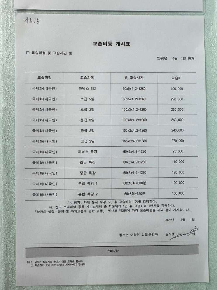 교습비등 게시표