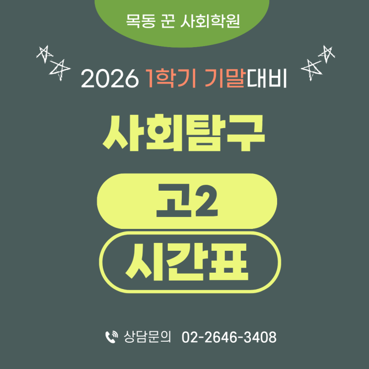 ※ 고2 수업은 꾼 사회학원 1관에서 진행됩니다. 양천구 신목로 81 try건물 3층(오목교역 7번출구 200m) 안녕하세요. 꾼 사회학원입니다. 현 고2부터 22 교육과정 개편 5등급제 도입으로 입시제도가 크게 바뀌면서, 내신·학생부·수능이 모두 대입 결과와 직결되는 구조가 되었습니다. 이러한 변화 속에서 고2 내신의 중요성은 그 어느 때보다도 높아졌습니다. 고2 학생들은 학기중에 주요 과목에 대한 공부와 수행평가 등으로 사탐과목까지 평소에 따로 공부할 시간이 모자라 미리 공부할 시간이 부족합니다. 좋은 내신 점수를 받기 위해서는 사탐학원의 도움을 받아 주요 과목에 집중하며, 사탐 내신 대비를 훨씬 수월하게 진행할 수 있습니다 고....... <img src="https://blogthumb.pstatic.net/MjAyNjA0MjFfMTUz/MDAxNzc2NzYyOTQ1ODMz.JGpwUPF1ce2mS6DPy7wROEFQKAEBj7ssSMgc0hc2OT0g.NnyMC7acgTGZwdA7wYyGbuEPvGljEfCR3iBgfiun4CQg.PNG/%B0%ED1_%C1%DF%B5%EE_%BD%C3%B0%A3%C7%A5_%281%29.png?type=s3" />