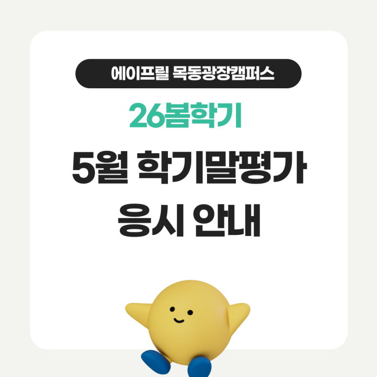 학부모님 안녕하세요 에이프릴 목동광장캠퍼스입니다! 26년도 봄학기가 절반 이상 지나고 있습니다. 다가오는 5월에는 봄학기 과정을 마무리하는 학기말평가가 진행될 예정입니다. 레벨별로 시험 일정과 시험 유형이 다르니 아래의 공지사항 꼭 확인 부탁드리며, 학생의 봄학기 레벨을 모르시는 경우 학원으로 문의 부탁드립니다^^ Achievement Test (정기평가고사) 응시 안내 Term Teest 응시 안내 6월 1일부터는 여름학기가 시작되며, 학기말평가 응시 후 담임선생님을 통해 성적 상담 및 새학기 수업 안내 연락 드리겠습니다. 시험 또는 새학기 수업 관련 문의사항이 있으신 경우 학원으로 연락 또는 올림 어플 1:1 문의 부탁드립니다. 감사합....... <img src="https://blogthumb.pstatic.net/MjAyNjA0MjNfMjE1/MDAxNzc2OTMyMjQ1NTI0.lRzCOr2RroUeBSvp7_UTUsWMKDaeT4IeJsEbkF2SA6cg.0OLqr8sBBVZh1HeQDG1XgjZOXmAgMNPEgpKl7Ux3FA8g.PNG/001.png?type=s3" />