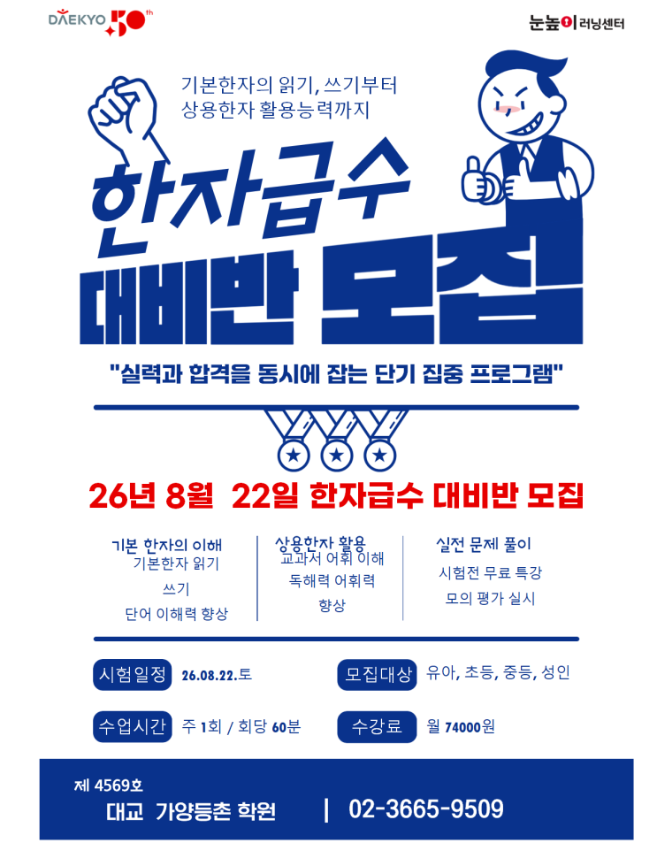 등촌3동 국어 문해력을 책임지는 눈높이 가양등촌학원에서 한자 검정 준비하세요!