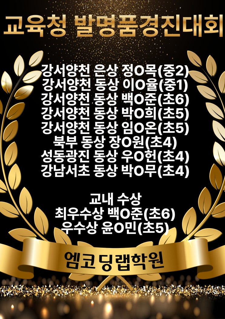 존경하는 학부모님. 안녕하세요. 강서 코딩학원 엠코딩랩입니다. 얼마전 발명품경진대회로 좋은 소식을 전달드렸었는데, 교육청에 출품한 9명의 학생 중 8명의 결과가 업데이트되어 소식 전달드립니다. 기쁘게도 9명의 학생 중 1명은 교육청 면접 진행 중이고, 나머지 학생 8명이 전원 수상을 하는 놀라운 결과가 나왔습니다! 교내 대회에서 선정되어 추후 각 교육지원청의 10개 작품 이내에 선정되었습니다~! + 추가 상장도 업로드하겠습니다! 수상 내역 - 강서양천교육청 과학발명품경진대회 은상 화O중2 정O목 - 강서양천교육청 과학발명품경진대회 동상 삼O중1 이O율 - 강서양천교육청 과학발명품경진대회 동상 송O초6 백O준 - 강....... <img src="https://blogthumb.pstatic.net/MjAyNjA0MTdfMjQw/MDAxNzc2NDEzNDUxMTMz.KFEOyDDdMUAFYY4ockqkXk53bfSXiLeHzLjr0lohVsEg.YoCZQbhKabxUhOW9j0Hf8gD_LEUSBtv3Gd4FUFPnA-sg.JPEG/2026%B3%E2%B5%B5_%BC%F6%BB%F3%B3%BB%BF%AA.jpg?type=s3" />